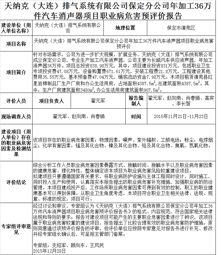 天纳克(大连)排气系统有限公司保定分公司年加工36万件汽车消声器项目职业病危害预评价