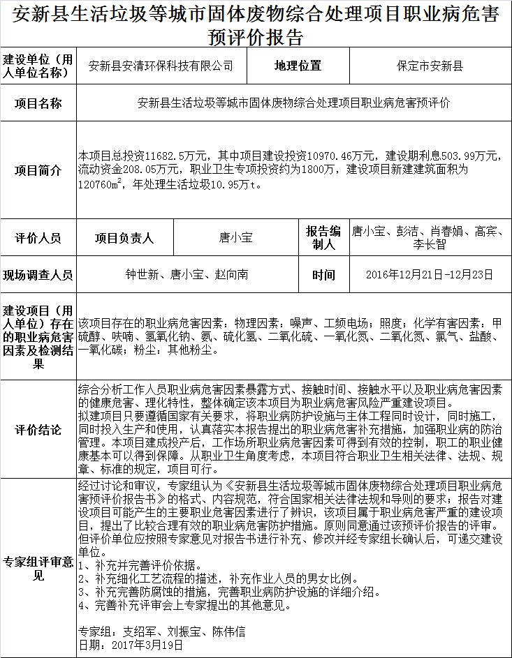 安新县生活垃圾等城市固体废物综合处理项目职业病危害预评价